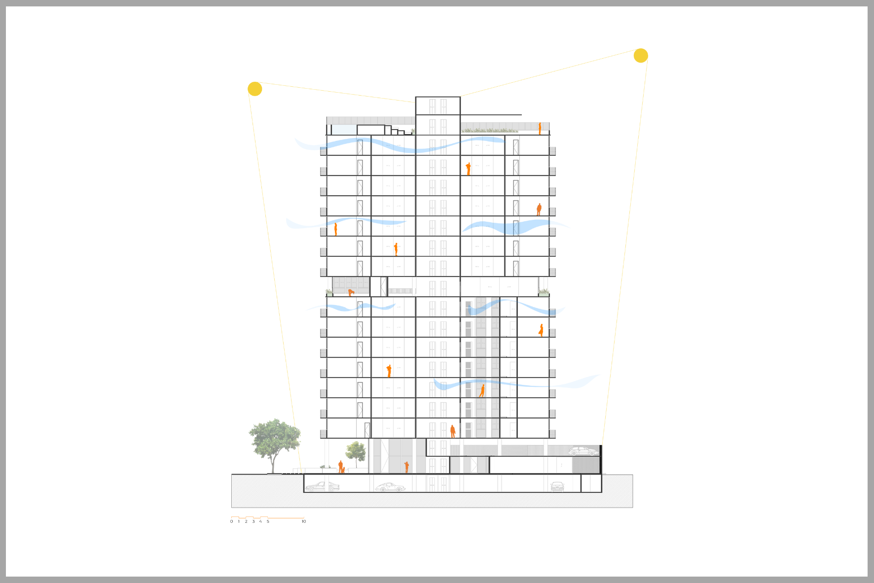 O projeto do Edifício Quadrata promove a integração urbana, com uma fachada ativa com espaço para vivência junto a cidade.